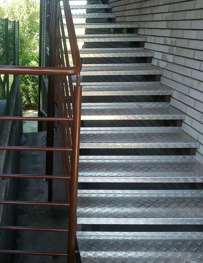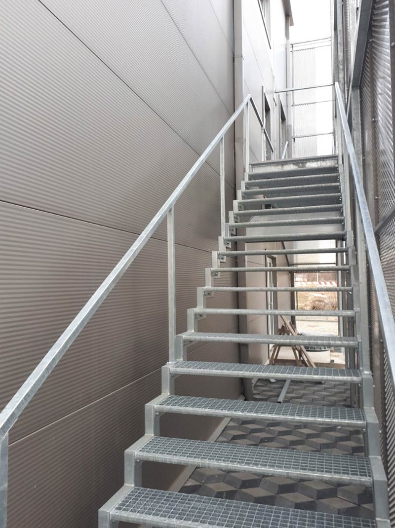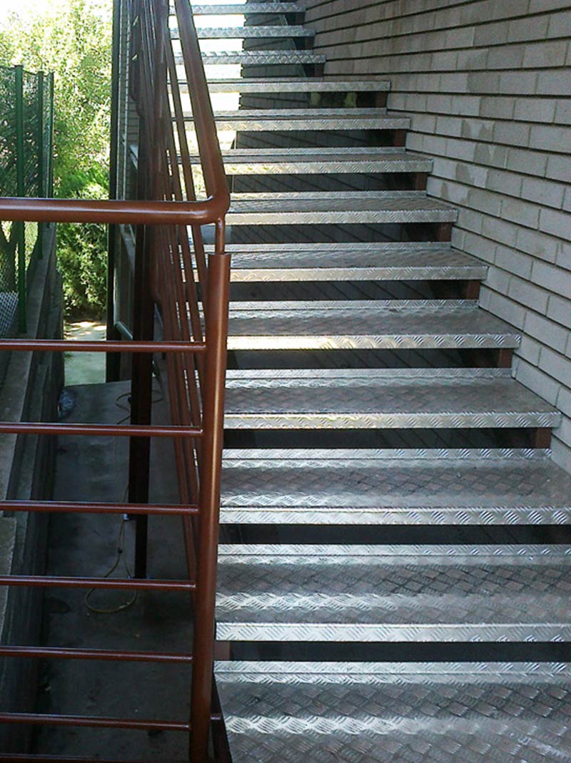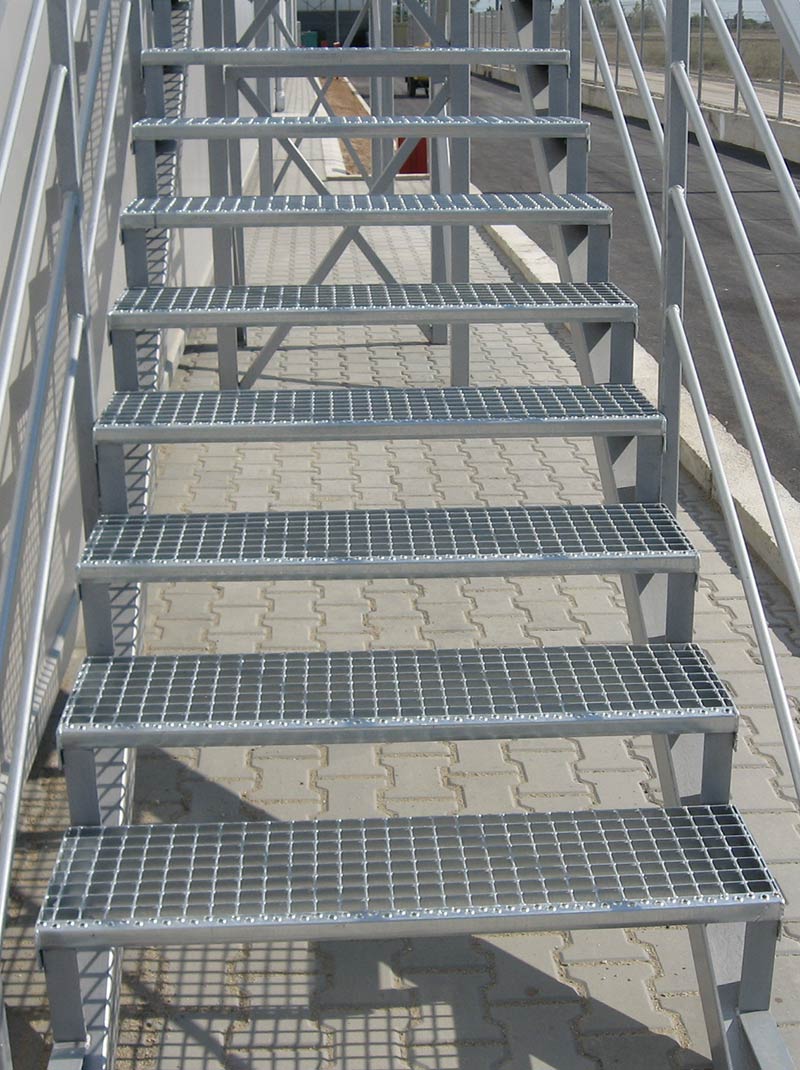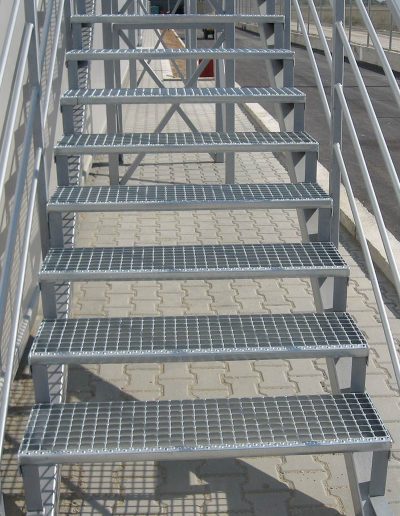 Stepenici su napravljeni od svih tipova rešetki i konstruisani su sa specijalnim bočnim stranama od trake dimenzija 70×3 mm i protiv-kliznim L profilom.